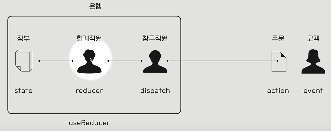 reducerํจ์ ๋ด์์ action์ ๋ฐ๋ฅธ ์ํ ์ ๋ฐ์ดํธ ๋ก์ง์ด ์์ต๋๋ค. ๊ณ ๊ฐ์ ๊ทธ์ ์ฐฝ๊ตฌ์ธ dispatch๋ฅผ ํตํด action์ ์๋ ค์ฃผ๋ฉด ์ํ ์ฅ๋ถ(state)๊ฐ ํ๊ณ์ง์์ด ๋ง๋ ์ ์ฐจ์ ๋ฐ๋ผ(reducerํจ์) ์ ๋ฐ์ดํธ ๋๋ ๊ฒ์ ๋๋ค.